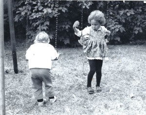 That’s me on the left. The swing was too high for me to get up on the seat, so I would lean over and balance my tummy on the seat and push off…wheeeeeee! Shelley looked on at me with some concern. Not sure if it was for my unconventional swinging style, or for my outfit. My high-water pants (showing off the always-fashionable black socks/white tennies combo) were green polyester. Of course, they perfectly coordinated with my Notre Dame Fighting Irish sweatshirt (see my Twitter profile picture for another view).
